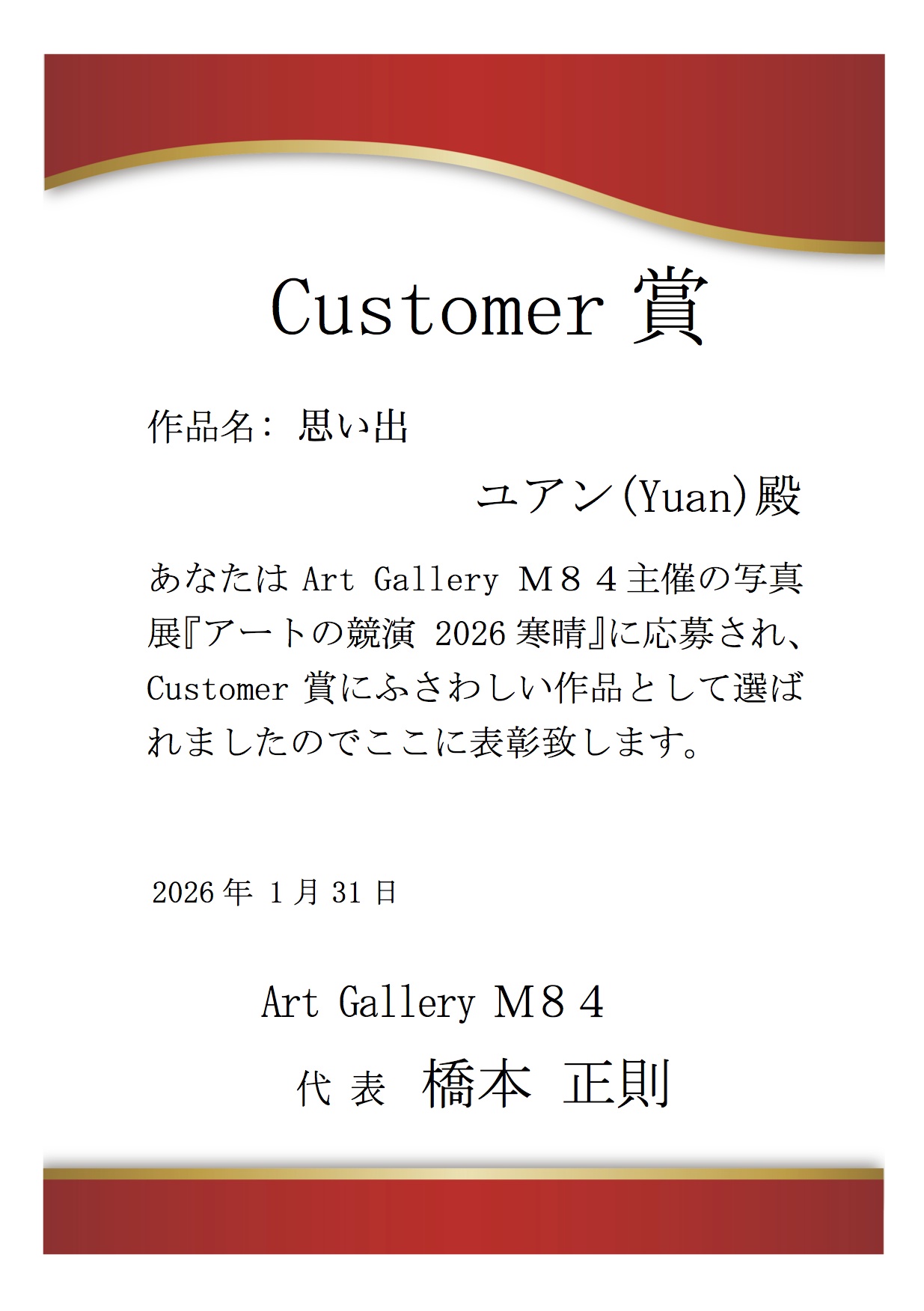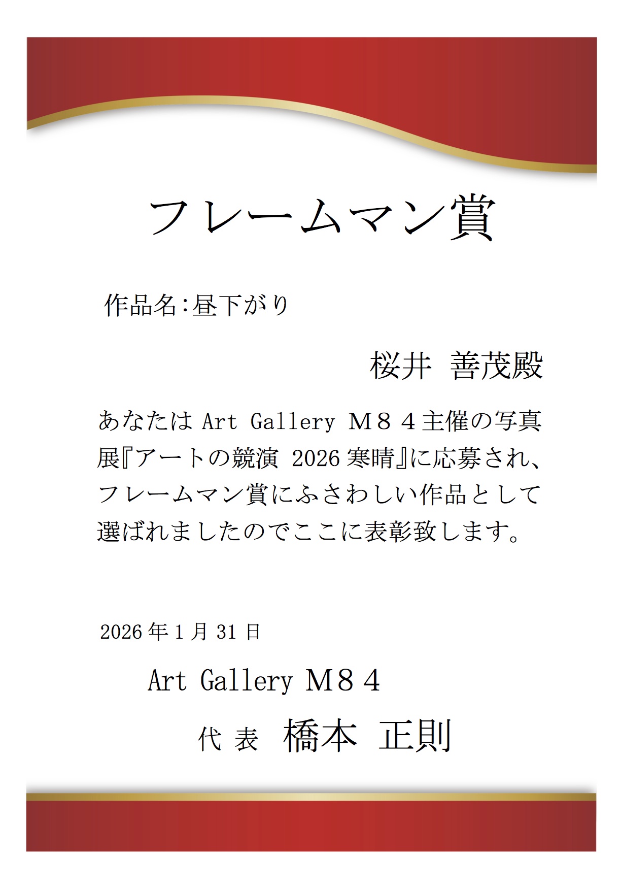 写真展『アートの競演 2026寒晴』受賞作品の賞状授与 投稿日時: 2026年2月1日 投稿者: Admin 写真展『アートの競演 2026寒晴』のクロージング【1月31日 (土) 16:00より】にて、受賞アート作品の賞状授与を行いました。受賞おめでとうございます。