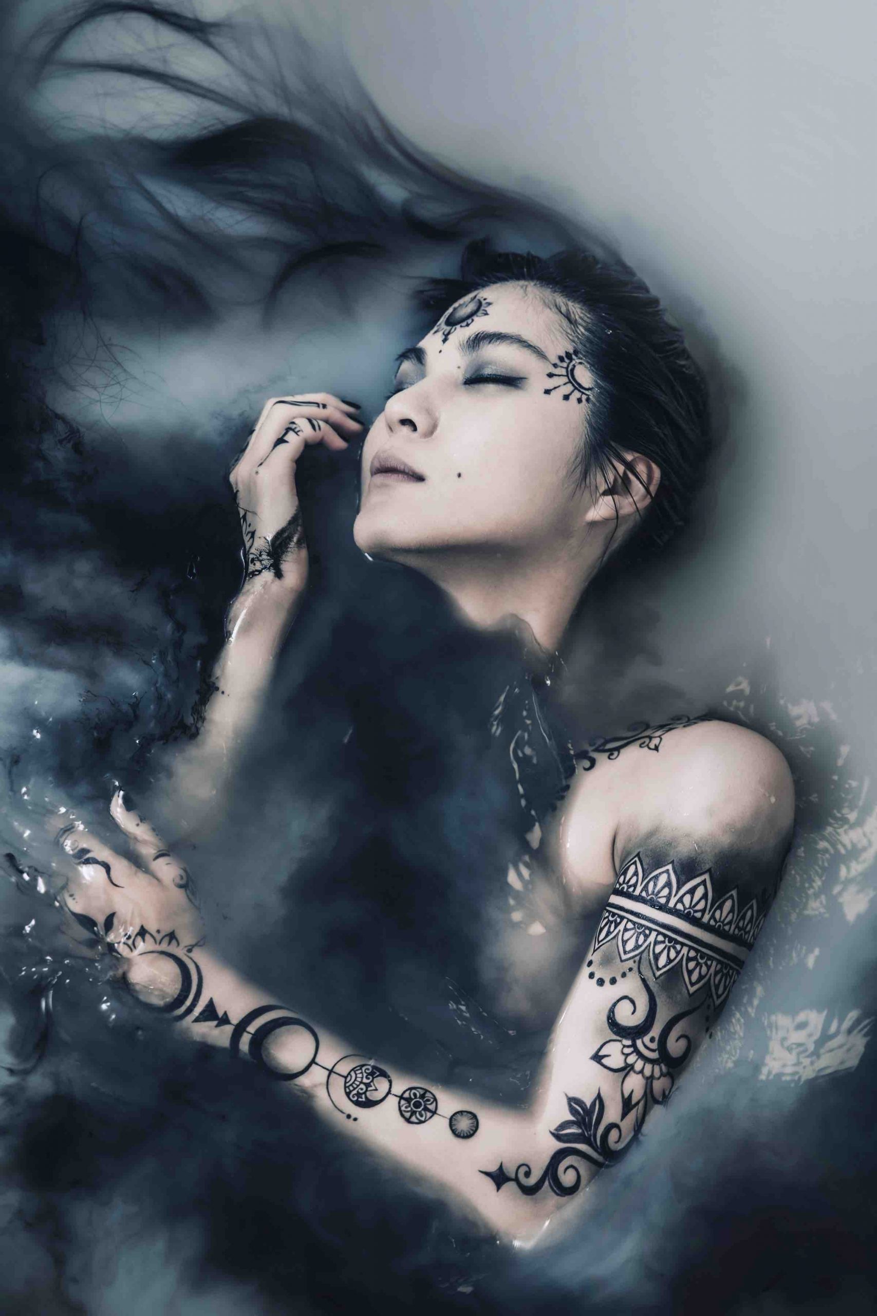 シリーズ「goddess」では、ギリシャ神話に登場する女神や日本の神道における巫女をモチーフとした作品が多く見られます。撮影にあたっては、被写体となる女性にあらかじめ物語を伝え、その世界に身を委ねてもらうことで、無意識に現れる動きや眼差しを写し、彼女たち自身も気づかない深層の表情をすくいとっています。