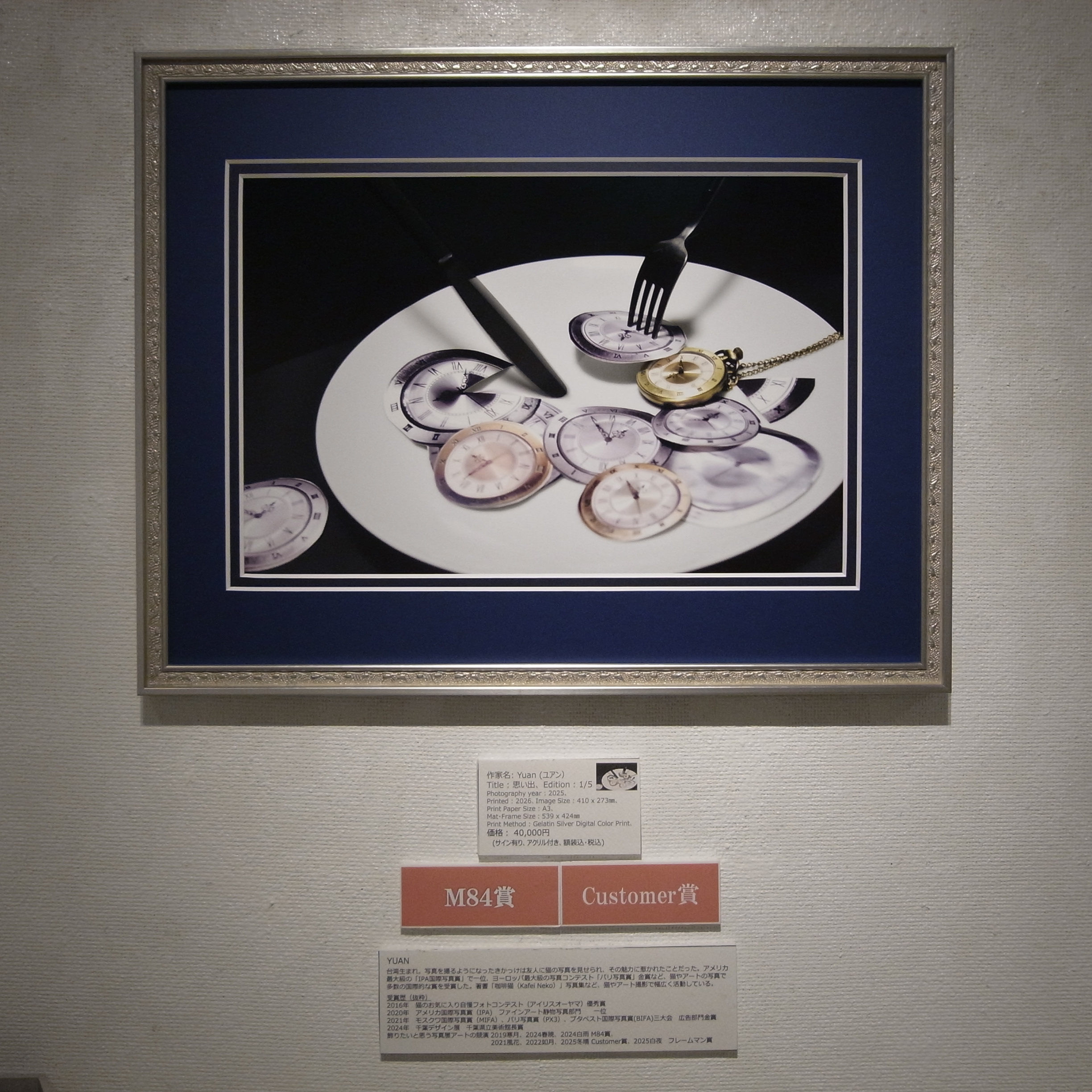 アートは、「オドロキ」なのだ。と言ってきたが、時計にフォークを刺す画像が印象的で、時刻の異なる沢山の時計が食材の様にお皿にあり、時計を食べるとはなんだろうと考えさせられるなんとも不思議な作品である。「思い出」とのタイトルを見て納得!ダブルマットの絵画風の額装も作品を引き立てている。これは、今まで見た事の無い表現の芸術的な作品である。