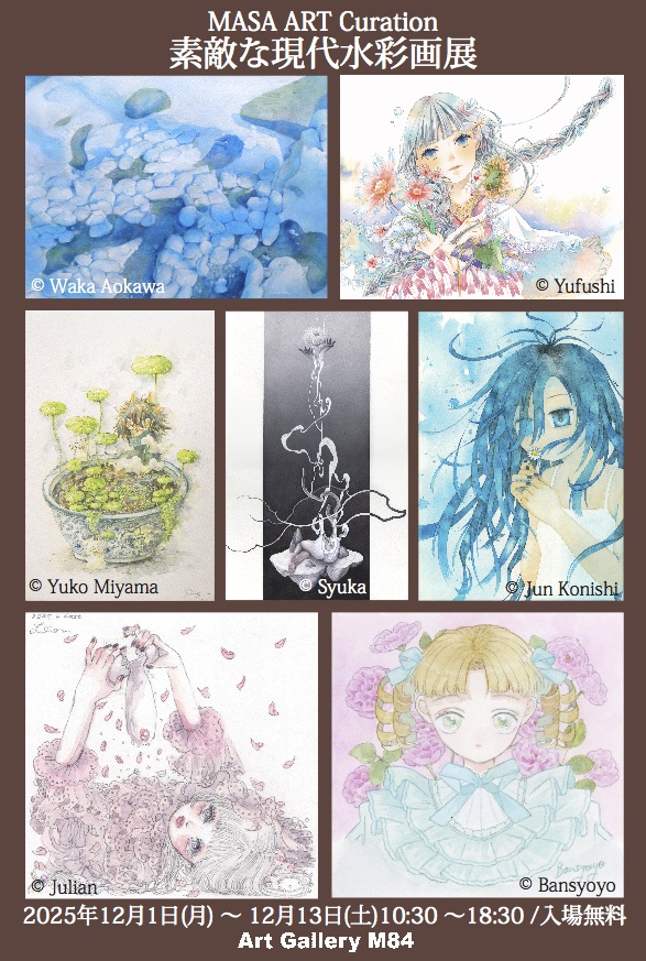 現代において水彩画は、一般的にも多くの方々に愛好されてますが、表現の幅が広く、計画性を持って描いていく必要があるため、特有の難しさも併せ持っています。しかしその分、油絵や日本画に劣らない奥深い魅力があることも確かです。今回展示する7人の作家は、それぞれ独特な技法や表現方法、そして世界観を持ち、観るものを魅了し続けています、ぜひこの機会に水彩画の世界に足を踏み入れてみてはいかがでしょうか。 【出展作家】 ◆宮間 夕子(Yuko Miyama) ◆小西 純(Jun Konishi) ◆朱 華(taupesyuka) ◆蒼川 わか(Aokawa Waka) ◆友風子(uko yufushi) ◆万翔葉(BANSYOYO) ◆慈愛李在(Julian) |